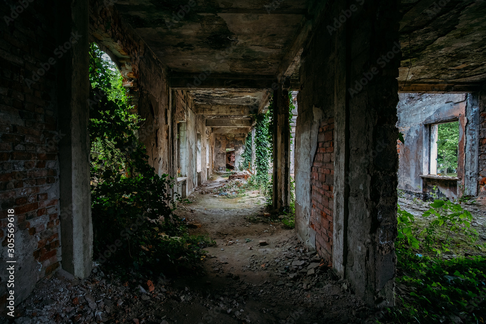 Obraz na plátně Ruined mansion corridor interior overgrown by plants