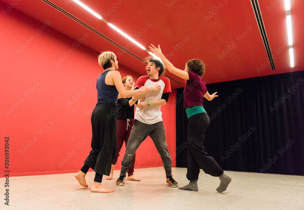 Obraz na plátně Group of young students standing and quarreling in dance class.