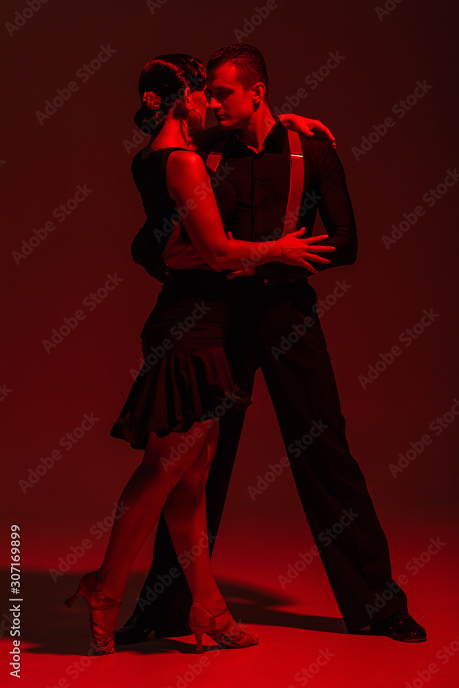 Obraz na plátně sensual couple of dancers performing tango on dark background with red illuminat