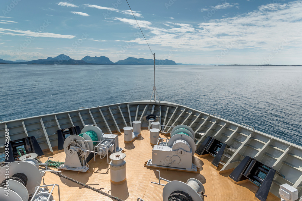 Obraz na plátně gear on cruiser prow deck and fjord landscape, near Skardsoya