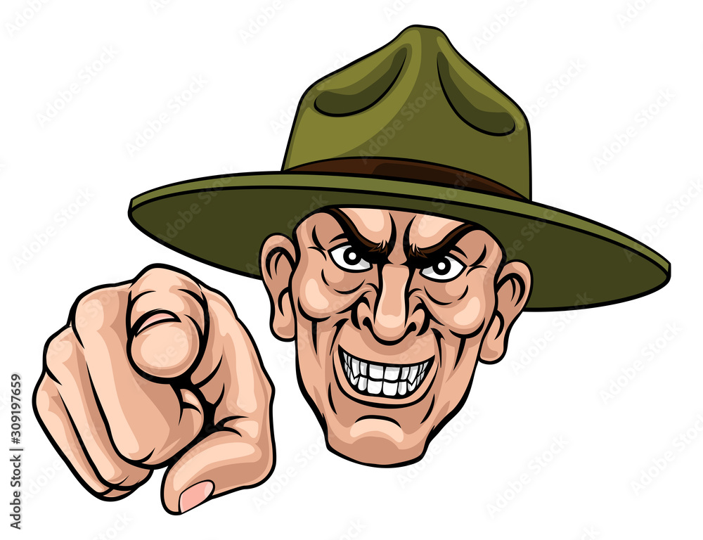 Obraz na plátně An army bootcamp drill sergeant soldier looking mean and pointing at the viewer