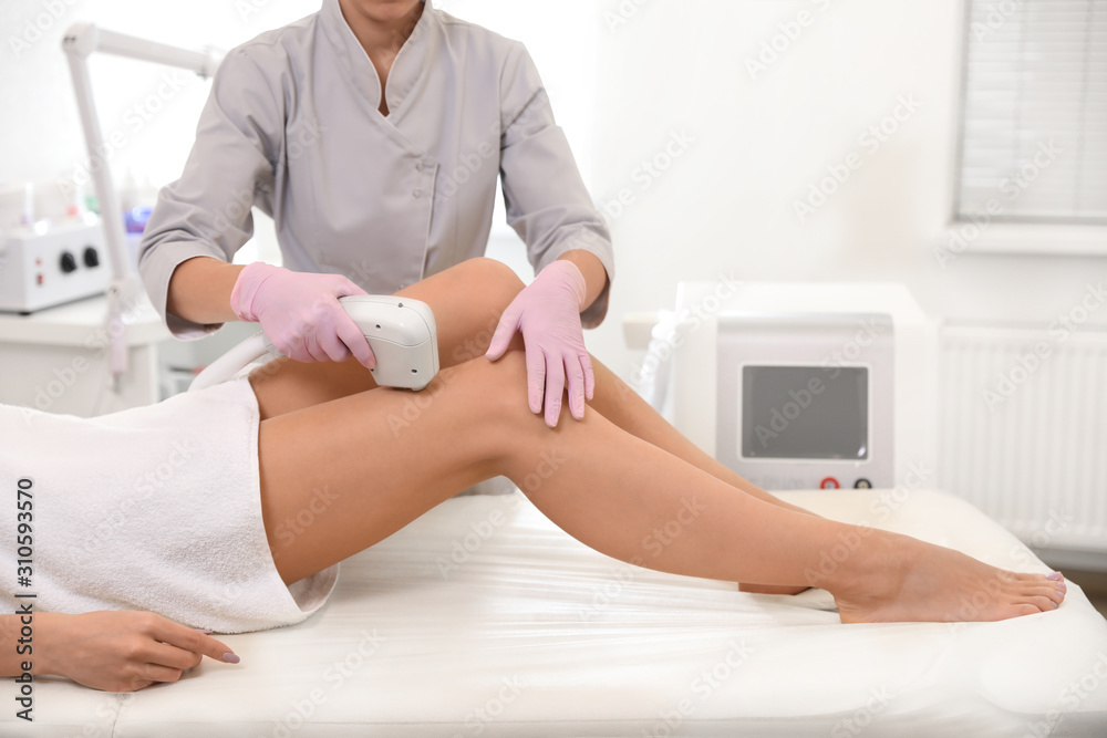 Obraz na plátně Young woman undergoing laser epilation procedure in beauty salon, closeup