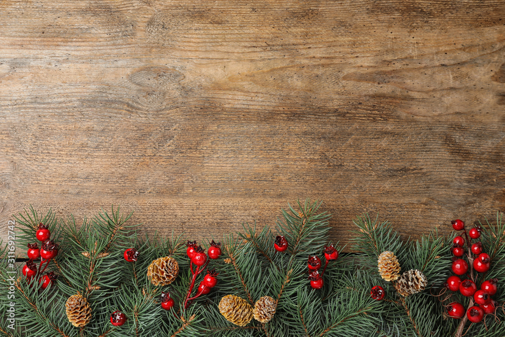 Obraz na plátně Flat lay composition with fir branches and berries on wooden background, space for text