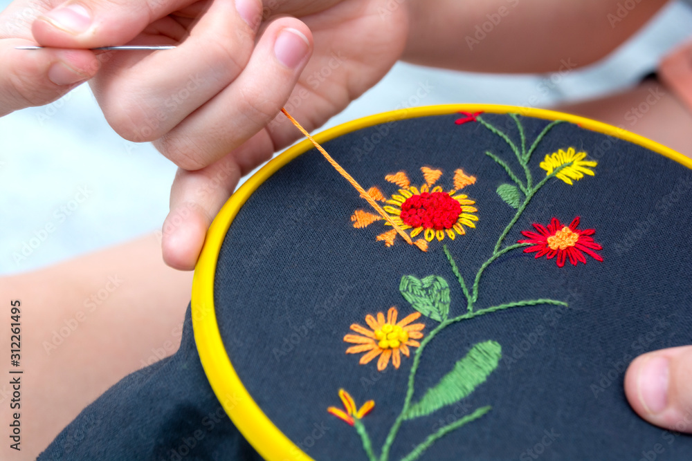 Obraz na plátně Women's hand embroidery in a hoop, a woman embroider a pattern on dark material