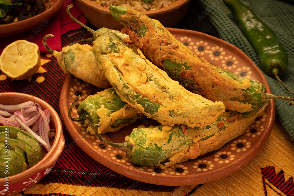 Obraz na plátně Traditional mexican chiles rellenos, rice and side dishes