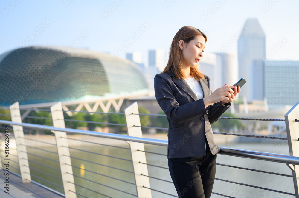 Obraz na plátně Young Asian business woman with Phone standing outdoors using smartphone in modern city financial district