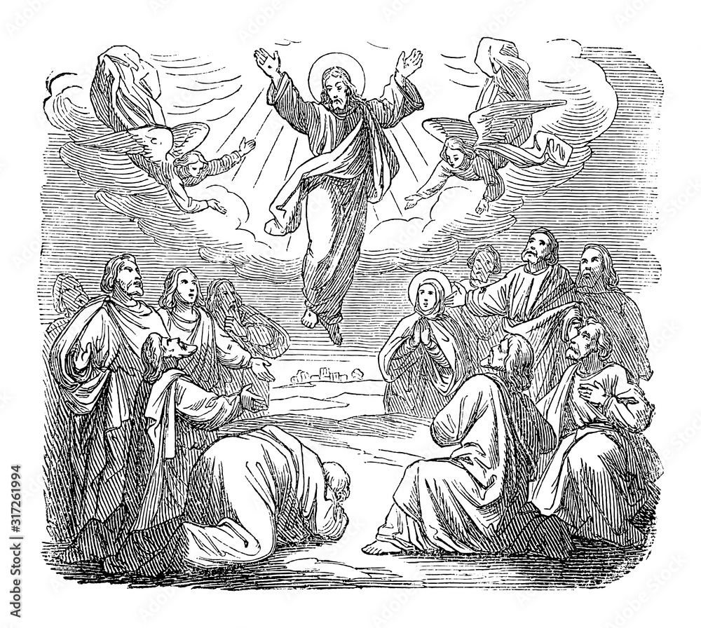 Obraz na plátně Antique vintage biblical religious engraving or drawing of resurrected Jesus is taken up to heaven