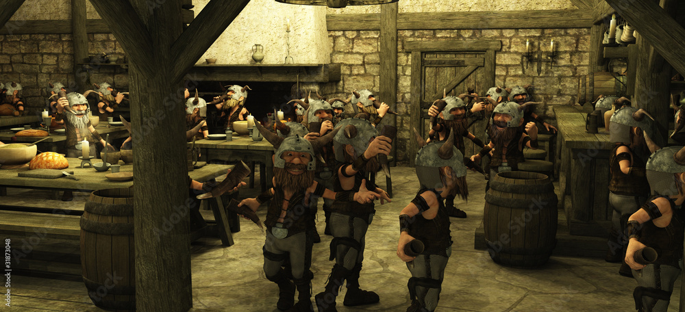 Obraz na plátně Toon Viking Dwarf Horde in the Tavern