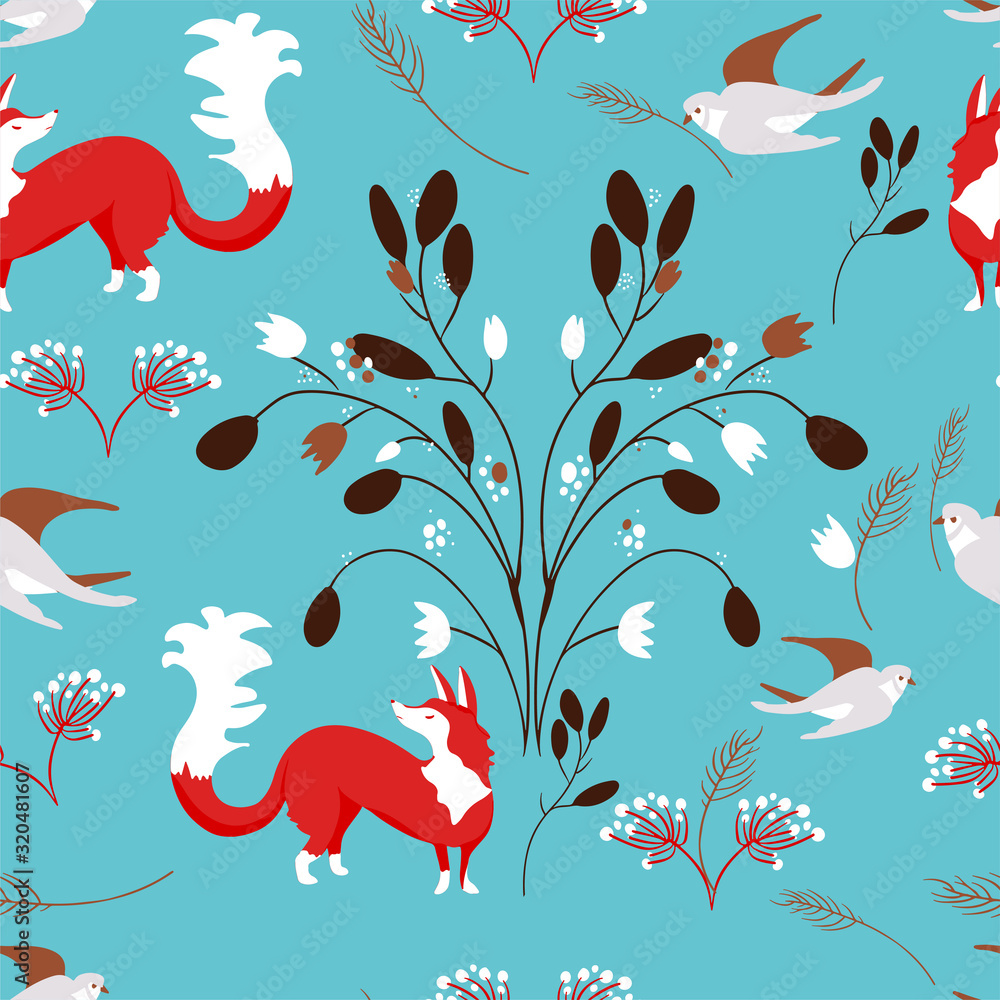 Obraz na plátně Scandinaviat folk art with fox, nordic style blockprint imitation