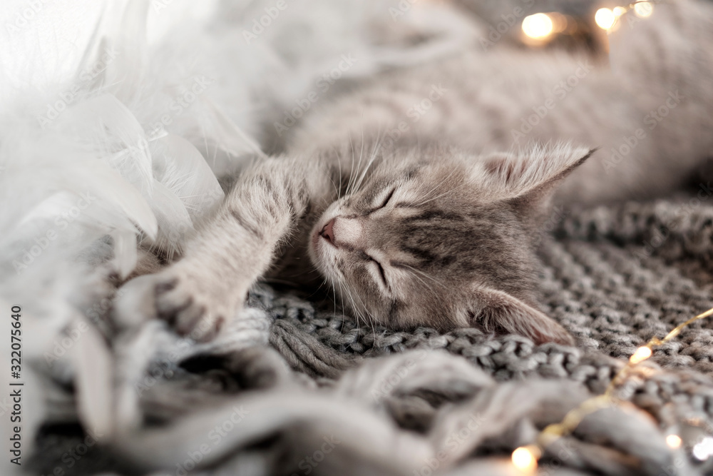 Obraz na plátně Cute little gray kitten is sleeping on a soft gray knitted plaid
