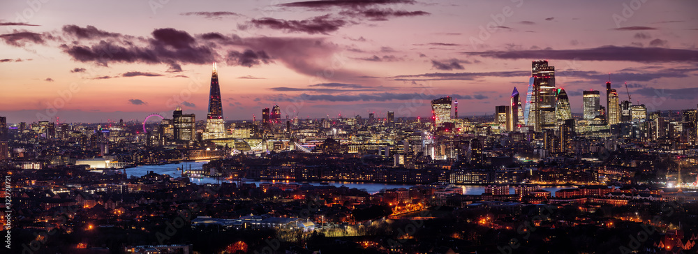 Obraz na plátně Weites Panorama der London Skyline am Abend mit rotem Himmel und den beleuchtete