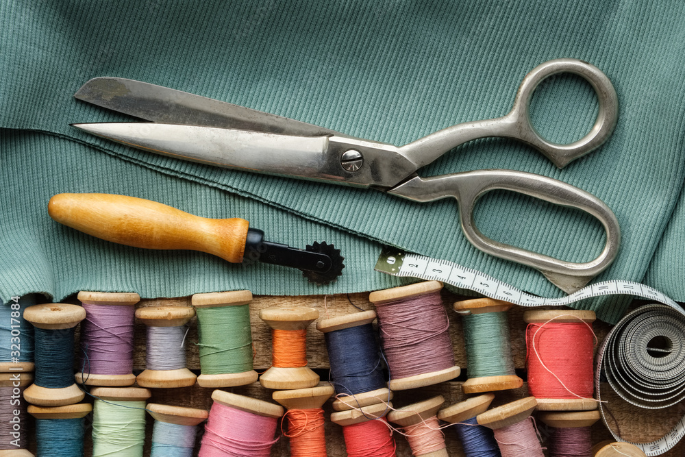 Obraz na plátně Sewing items: retro tailoring scissors, measuring tape, wooden spools of threads, cutting knife and green cloth