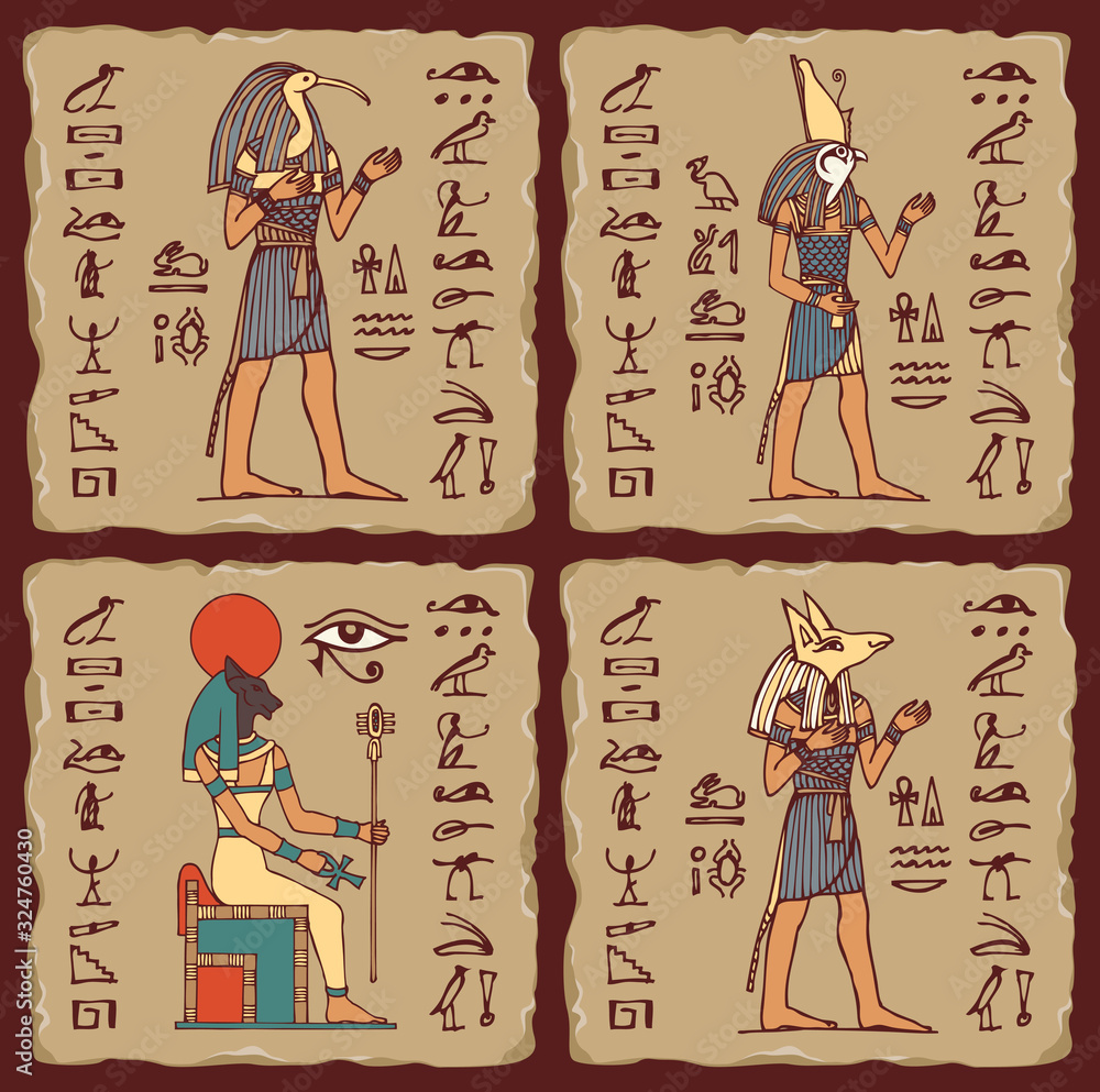 Obraz na plátně Set of vector banners in the form of ceramic tiles with Egyptian gods and hieroglyphs