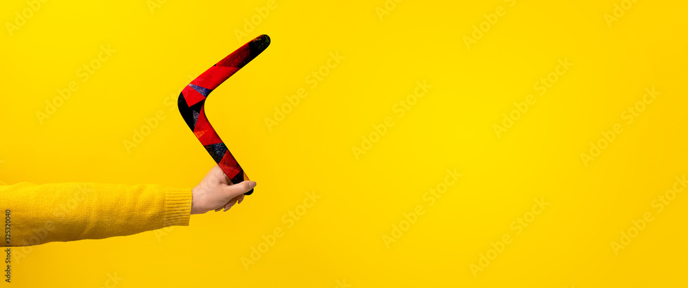 Obraz na plátně boomerang in female hand over yellow background, panoramic mock-up with space fo