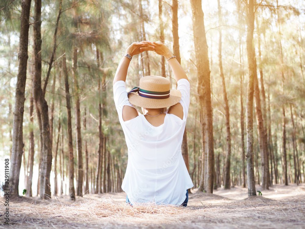 Obraz na plátně Thai women sitting with relaxation in pine forest, travel with happiness and slow life concept