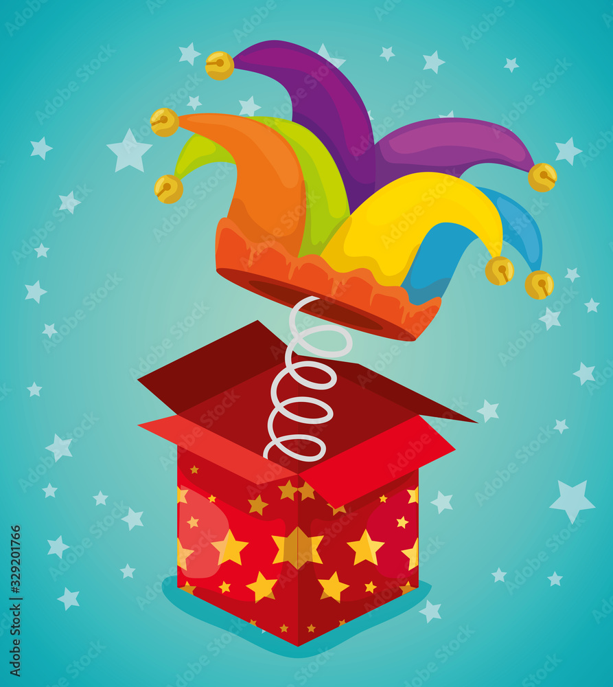 Obraz na plátně box surprise with hat buffoon of april fools day vector illustration design