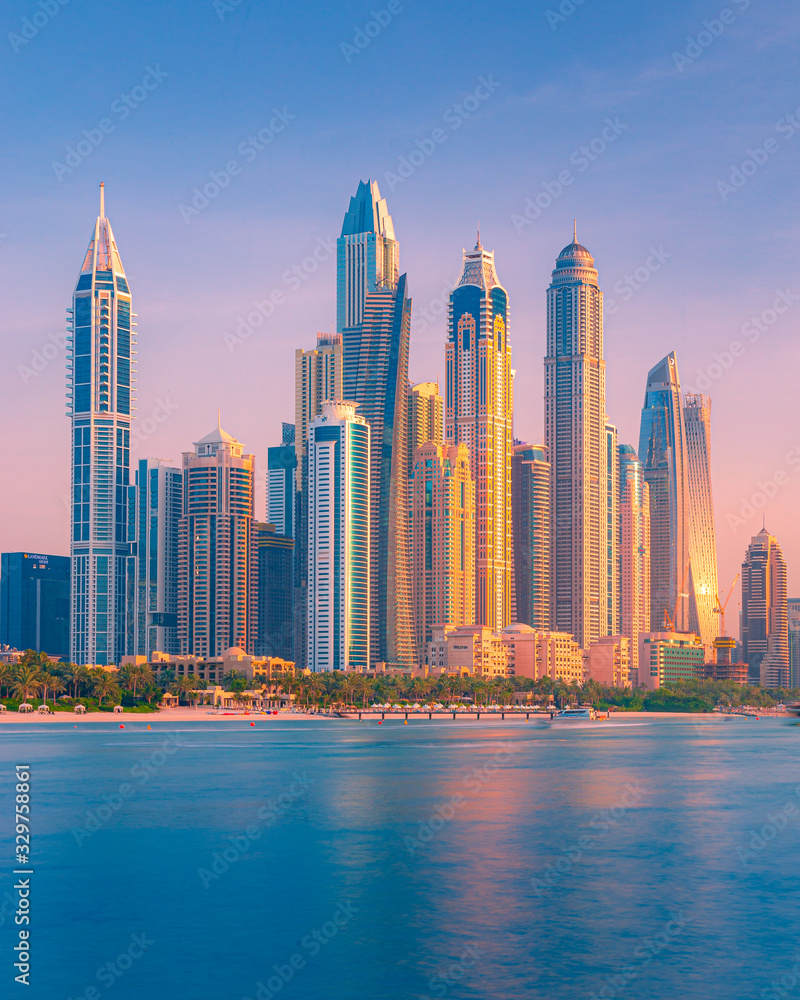 Obraz na plátně Sunset view of high rise buildings and skyscrapers in Dubai Marina during golden