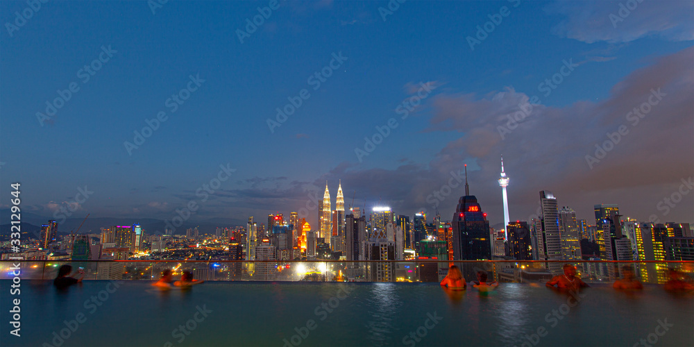 Obraz na plátně City skyline at famous rooftop swiming pool at evening , with night city Kuala L