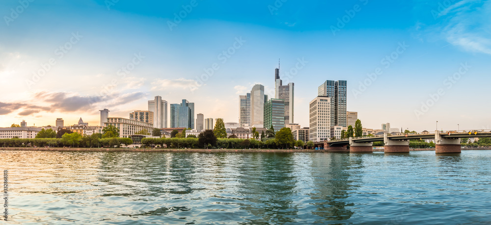 Obraz na plátně Panoramic view of Frankfurt am Main skyline with touristic boat, promenade and s