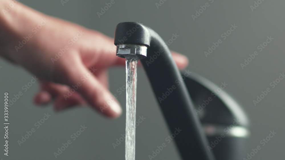 Obraz na plátně Woan is opening and closing water flow tap and filling sink with water