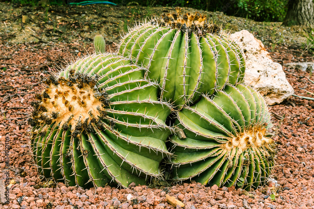 Obraz na plátně Detail shot of the cactus Ferocactus schwarzii on stony ground with dried flowers and orange flower ends in autumn
