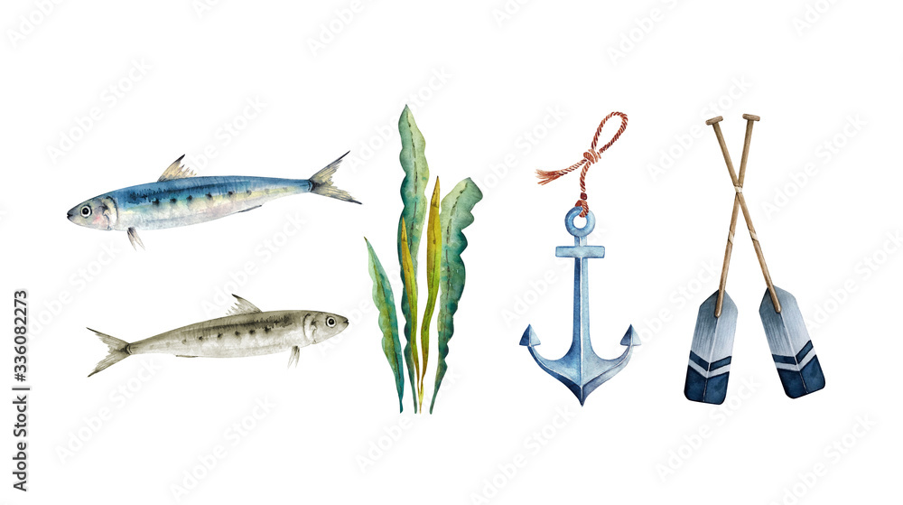 Obraz na plátně Set of watercolor illustrations in a marine style