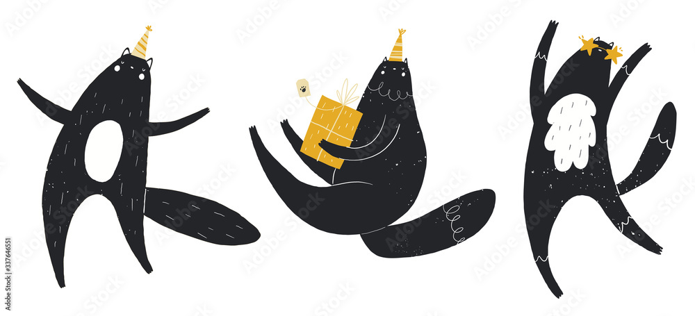 Obraz na plátně Vector hand-drawn color festive set with cute cats on a white background