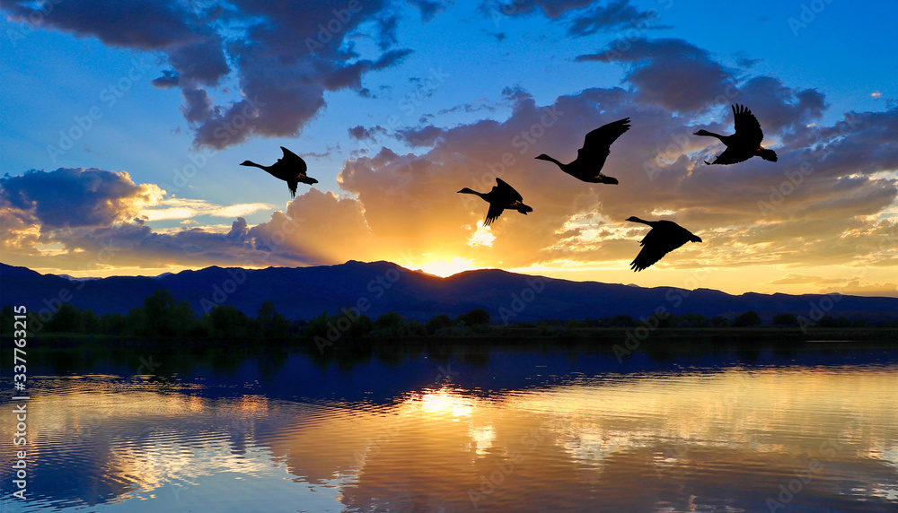 Obraz na plátně Canada geese flying over a lake at sunset