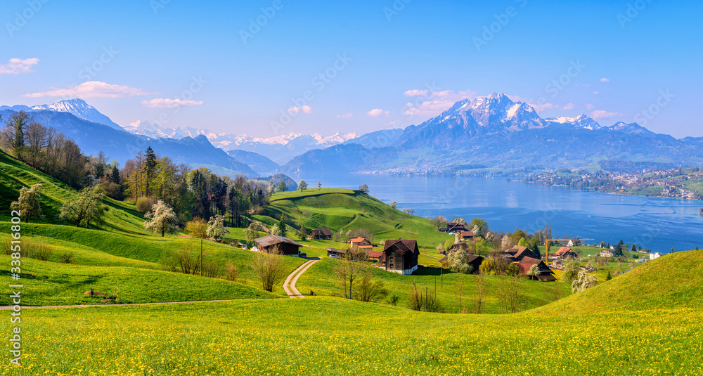 Obraz na plátně Lake Lucerne and Mount Pilatus in spring time, Switzerland