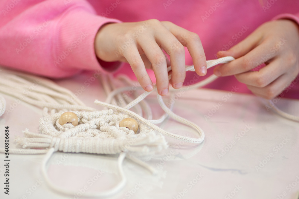 Obraz na plátně Children's hands weave from a cord, a macrame weaving master class