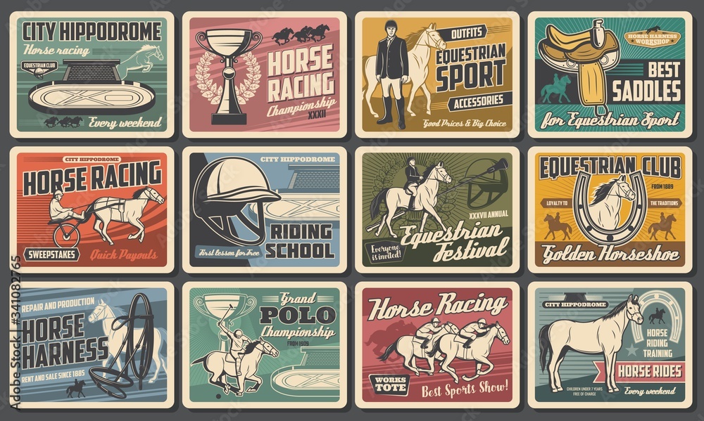 Obraz na plátně Racehorse and jockey retro posters of horse racing, equestrian sport, riding club and polo vector design