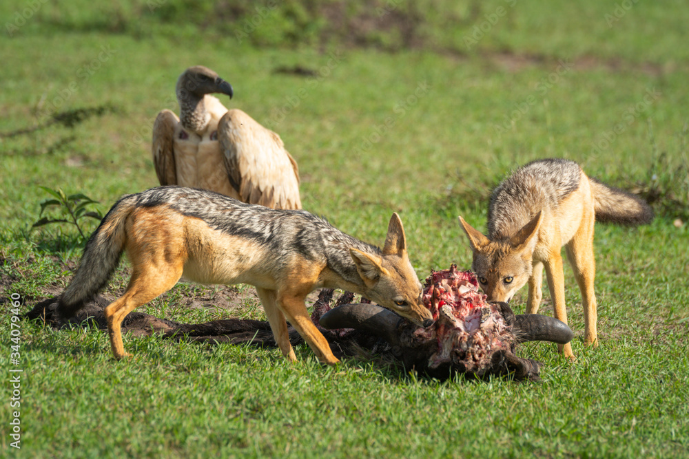 Obraz na plátně Two black-backed jackal feed on wildebeest carcase
