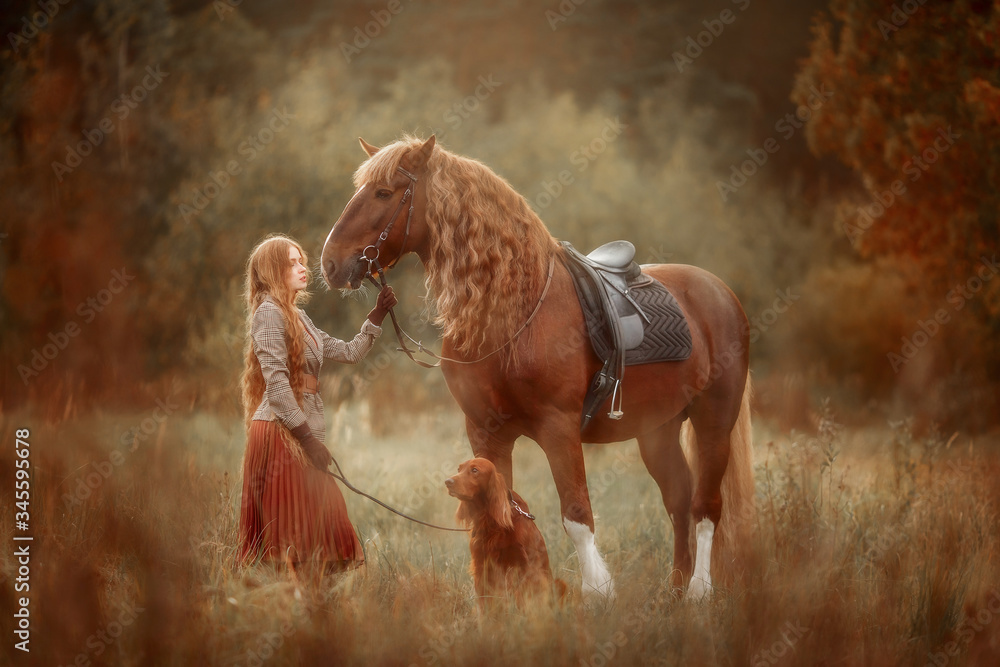Obraz na plátně Beautiful long-haired blonde young woman in English style with red draft horse,
