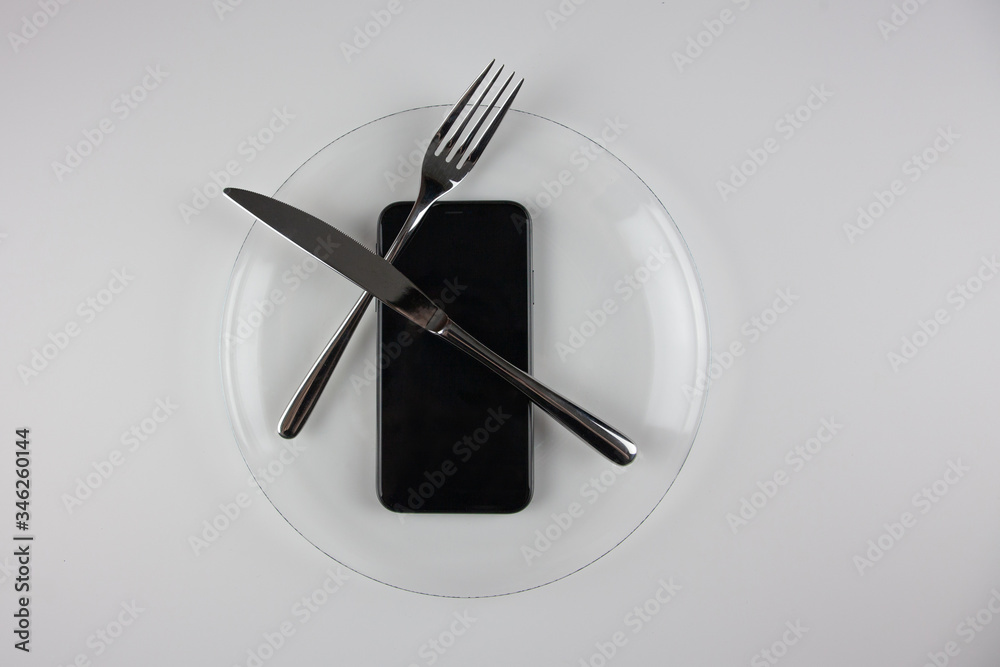 Obraz na plátně An iron fork and knife with a phone on a transparent dish