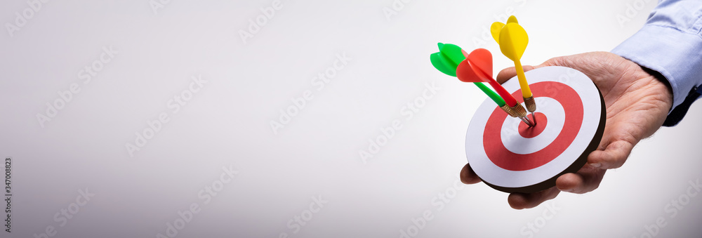 Obraz na plátně Human Hand Holding Colorful Darts On Target