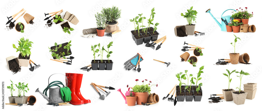 Obraz na plátně Set of different seedlings and gardening tools on white background