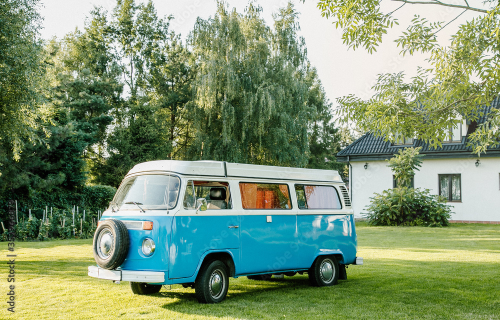 Obraz na plátně Blue classic retro vehicle parked near hangar