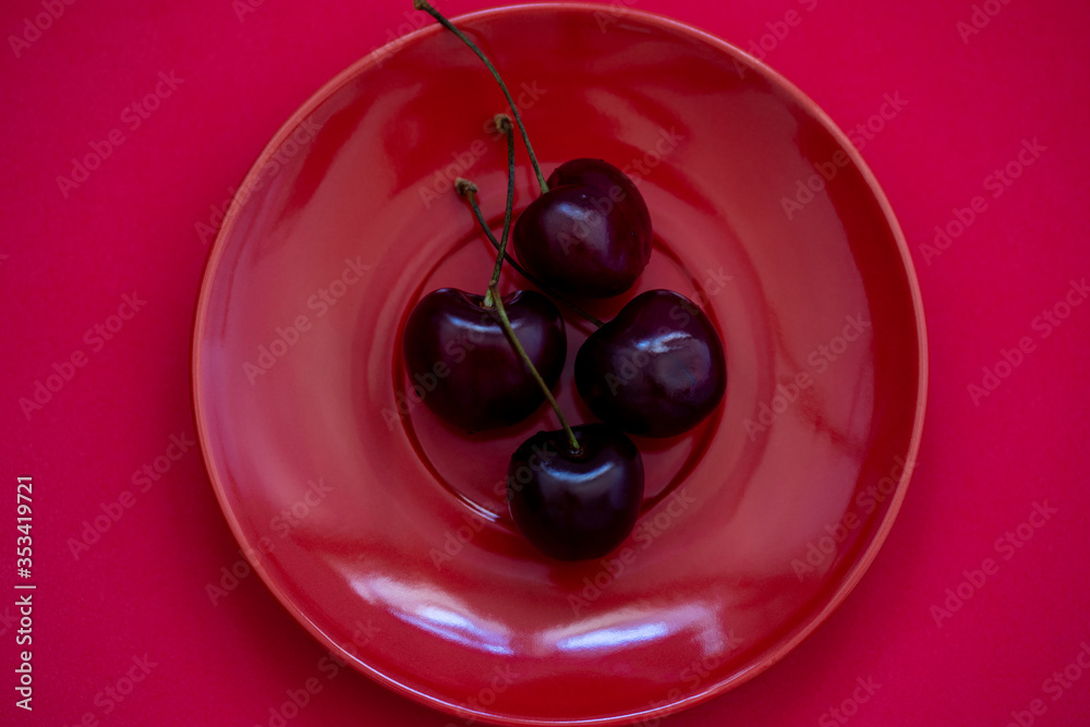 Obraz na plátně Four wild cherries or gean berries on a red plate