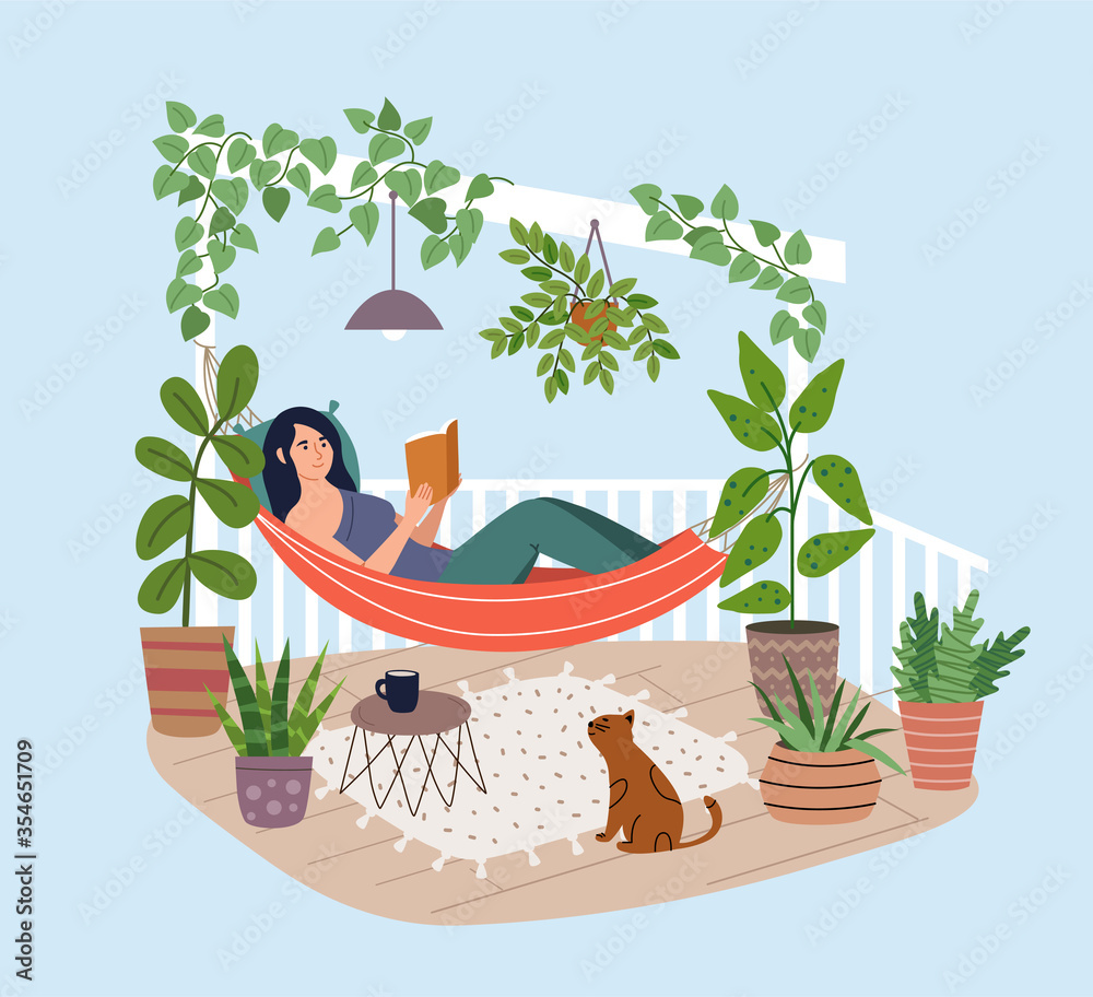 Obraz na plátně Young woman relaxing in hammock on the terrace
