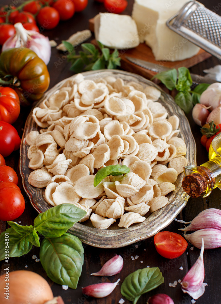 Obraz na plátně Fresh raw italian pasta orecchiette, vegetables, herbs and olive oil
