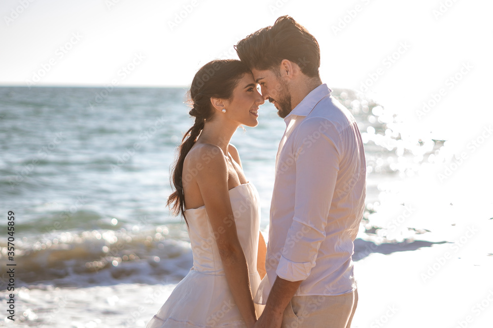 Obraz na plátně Wedding beach young couple sunset sand white happy sea waves