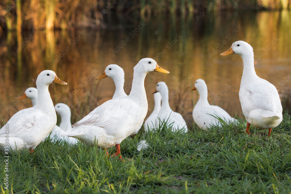 Obraz na plátně The Pekin or White Pekin ducks standing next to their pond
