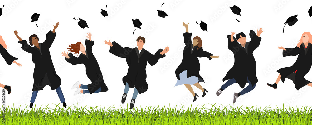 Obraz na plátně Seamless border with happy graduate students in graduation clothing jumping on the lawn and throwing the mortarboard high into the air