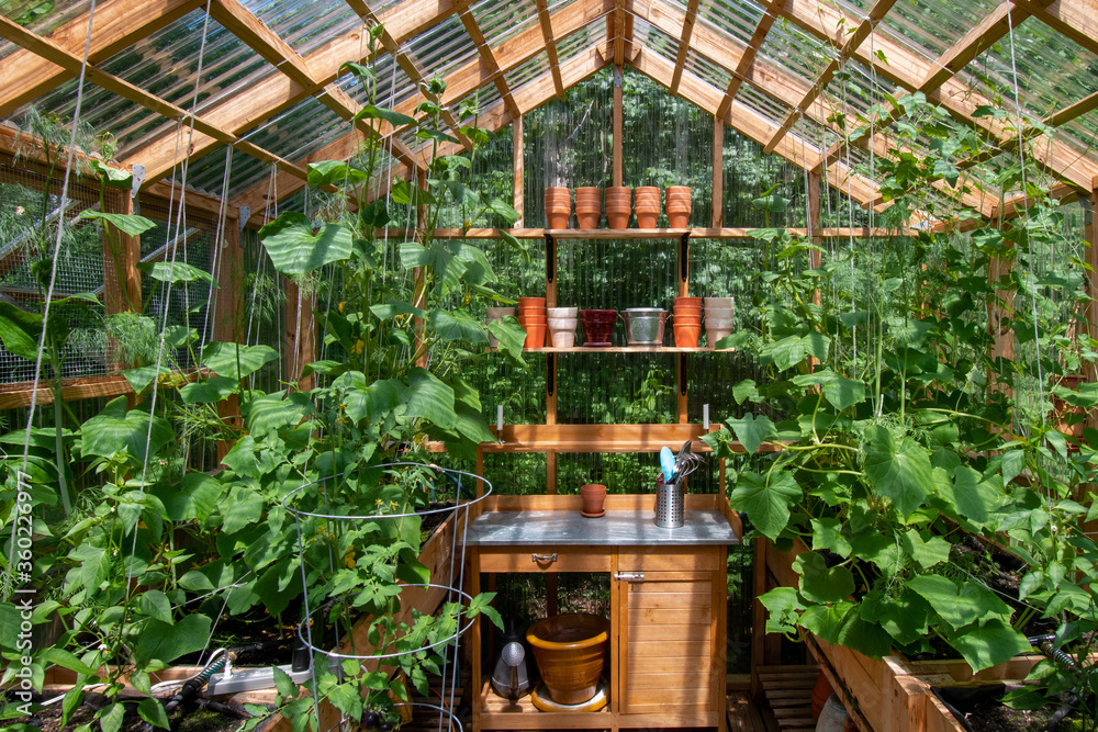 Obraz na plátně Interior of a wooden domestic greenhouse for growing vegetables