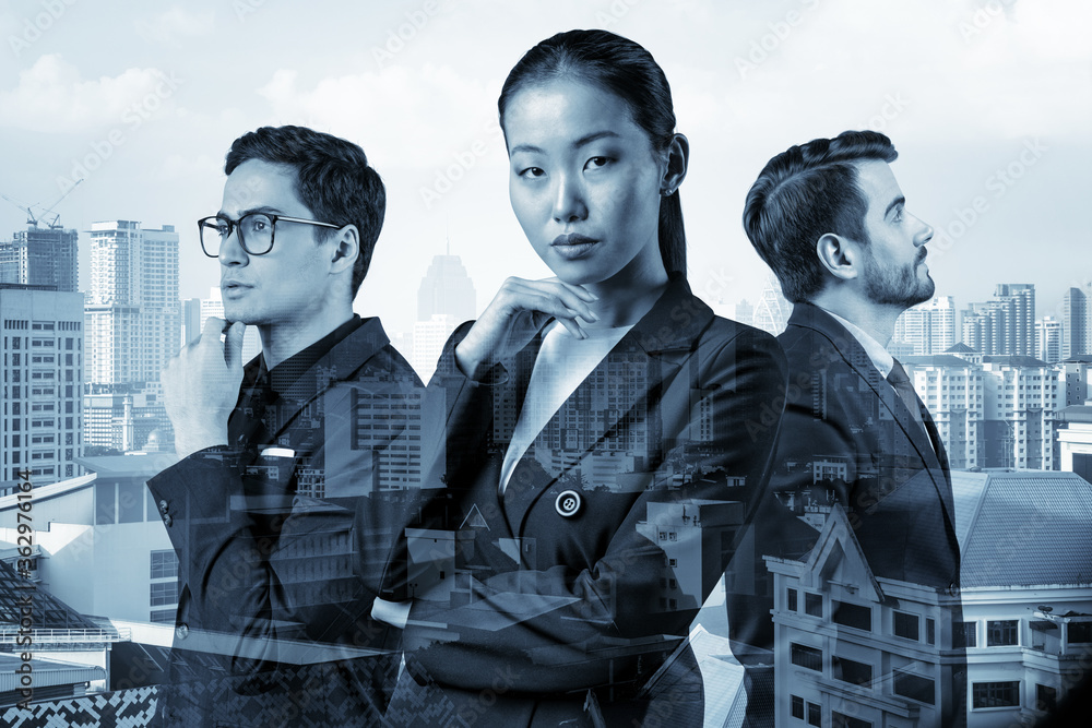 Obraz na plátně Group of three business colleagues in suits dreaming about new career opportunities after MBA graduation