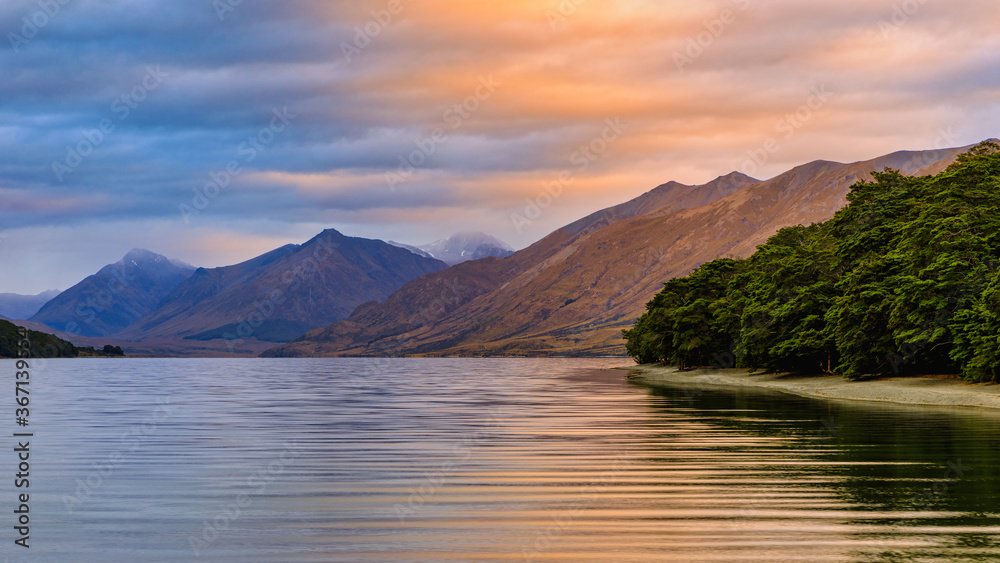 Obraz na plátně North Mavora Lake surrounded by forests with mountains in the background at sunset on a cloudy day