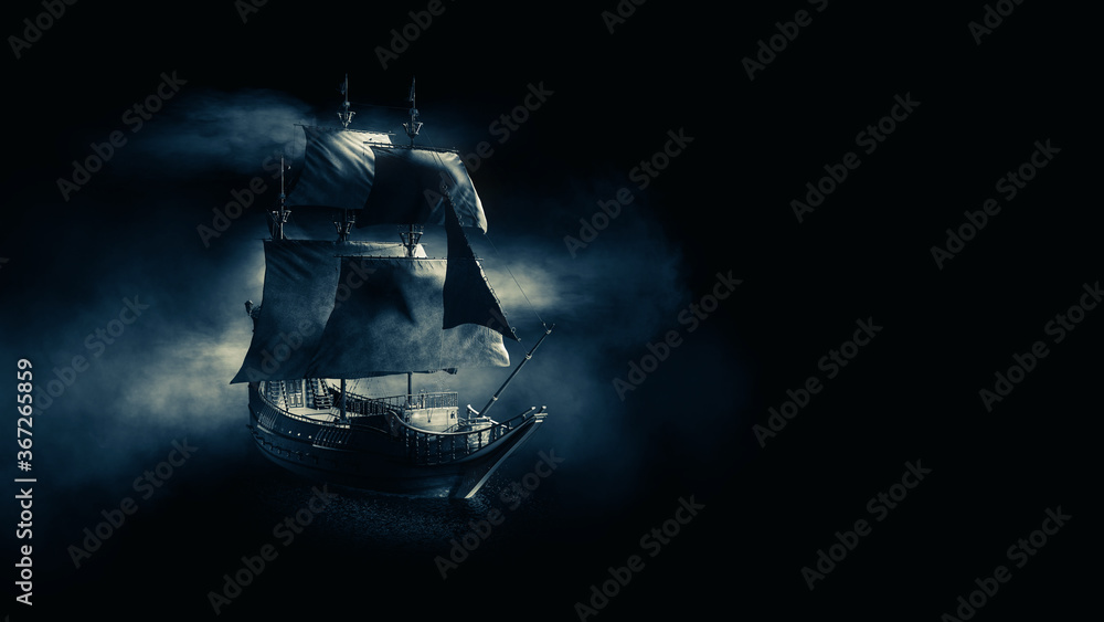 Obraz na plátně ( 3D illustration, Rendering ) VIntage black pirate ship sailing on a dark fogg