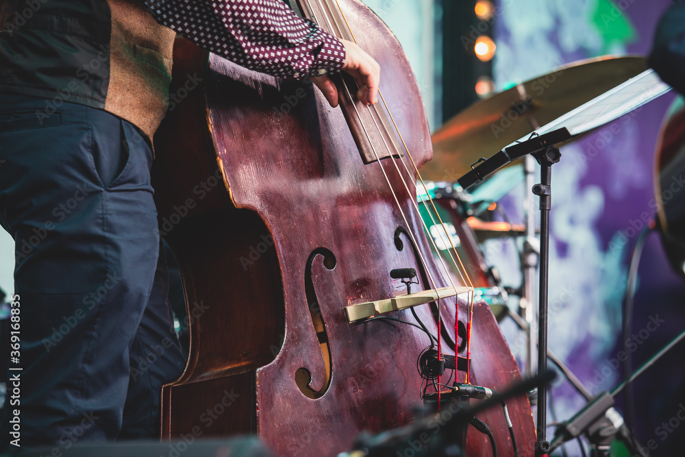 Concert view of a contrabass violoncello player with vocalist and musical during jazz orchestra band performing music, violoncellist cello player on stage