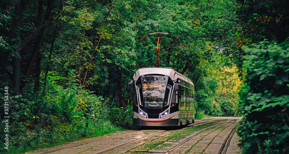 Obraz na plátně Modern Russian tramway in Moscow. A tram line among the forest. .