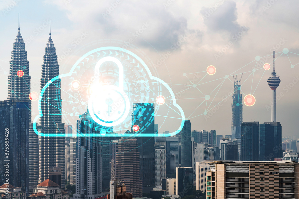 Obraz na plátně Padlock icon hologram over panorama city view of Kuala Lumpur to protect business, Malaysia, Asia
